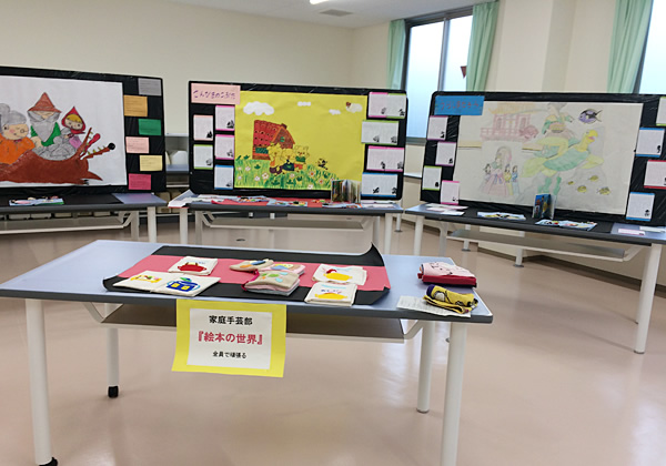 家庭手芸部は、週2日活動しています。昨年の文化祭では、子どものころに読んだ「赤ずきん」「うらしまたろう」「3びきのこぶた」の「絵本の世界」を主にフエルトを使い製作しました。細かい作業で思った以上に時間もかかり、大変でしたが全員で協力して作品をつくり上げることができました。そして、何よりもの楽しみが、お菓子作りです。学年の隔たりもなく、いつも楽しく活動しています。