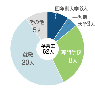 卒業後の進路状況をコース別にまとめました。四大・短大・専門学校への進学、就職と多岐にわたります。